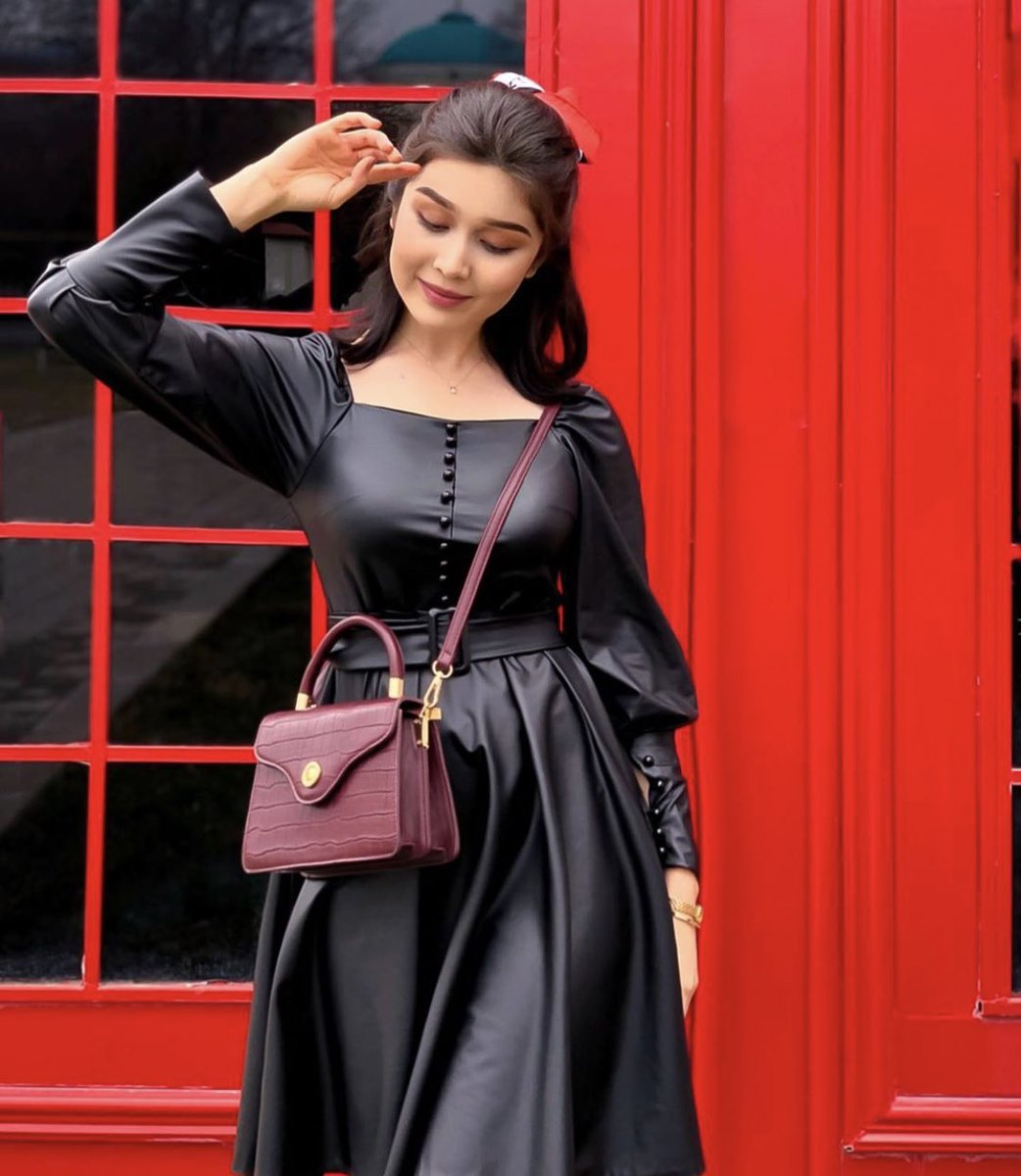فستان جلد اكمام متوسطة الطول لون اسود شيك هانم