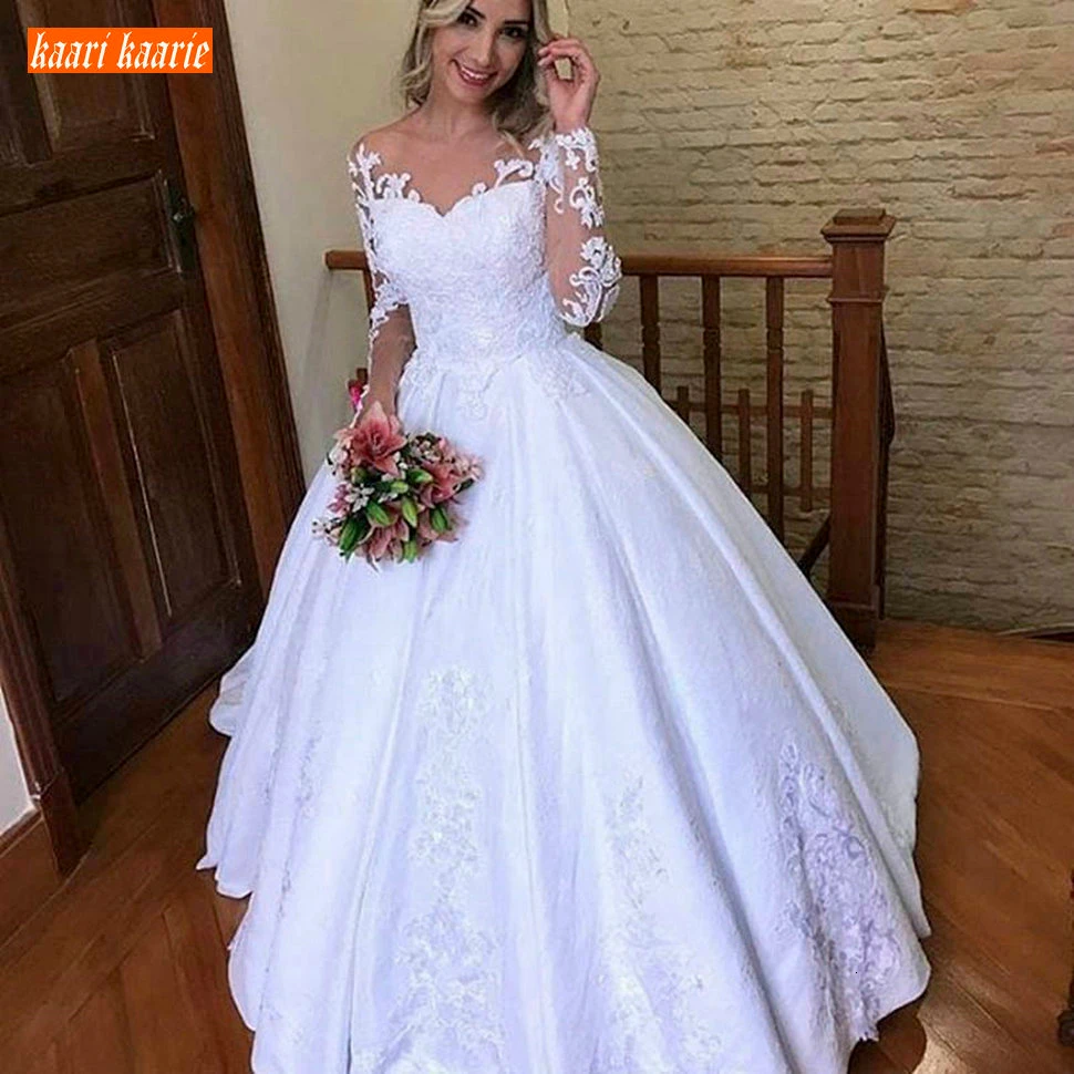 فستان زفاف من الساتان بأكمام طويلة مع زينة دانتيل فستان زفاف أبيض ناعم برقبة على شكل V جودة عالية الأميرة Wedding Dresses Aliexpress
